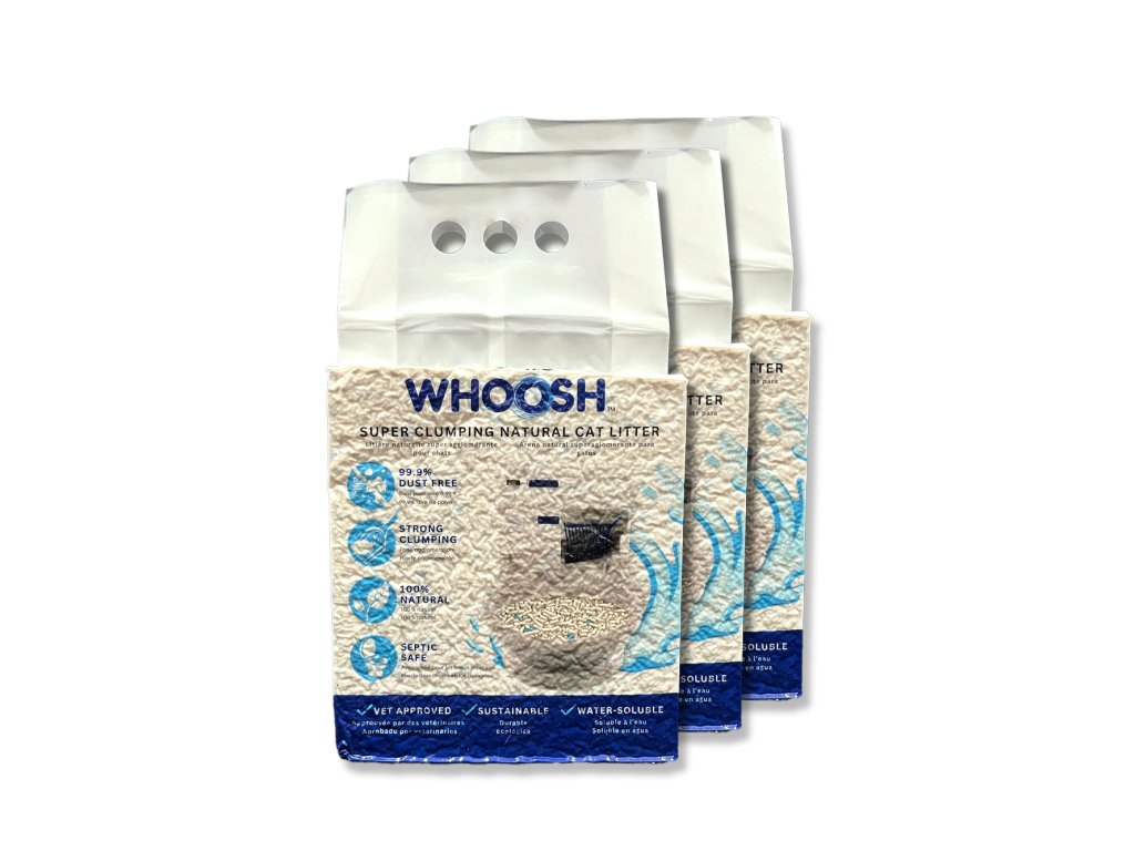 Granule Whoosh jsou vyrobeny z potravinářské sójové drti, která vzniká jako vedlejší produkt při výrobě tofu. Díky tomu jsou zcela netoxické, rozpustné ve vodě a bezpečně splachovatelné. Představují tak šetrnou a ekologickou alternativu ke klasickému stelivu. Jejich jemná a měkká konzistence je ideální i pro citlivé kočičí tlapky.