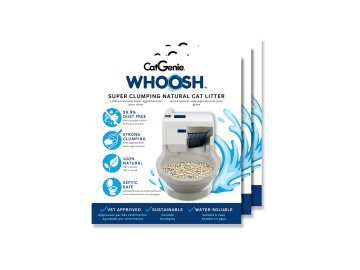 Ekologické kočičí granule CatGenie Whoosh účinně spojují tekutý i pevný odpad do hrudek, které se poté snadno odeberou, rozmělní a bezpečně odplaví.
